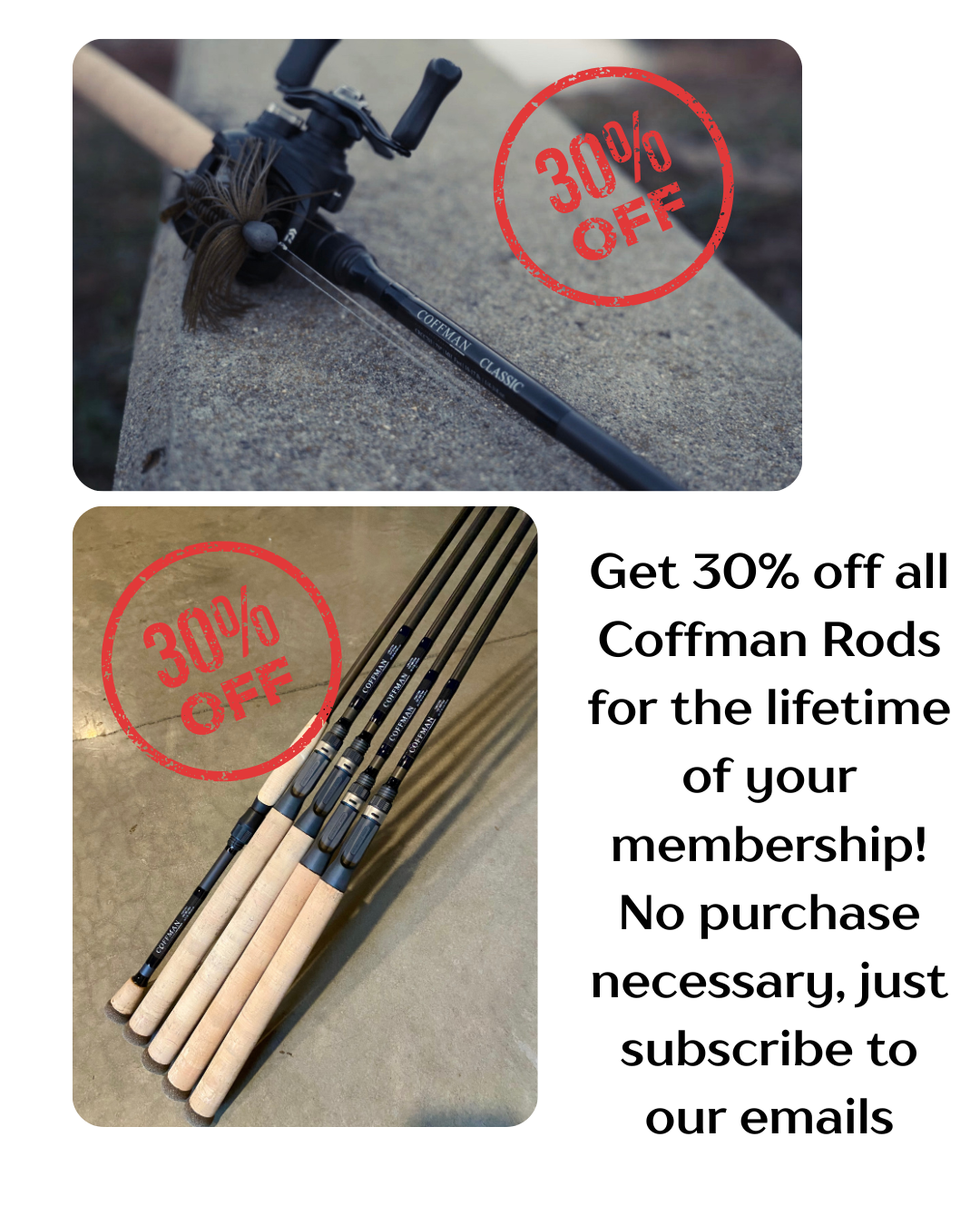 Each of our rods are hand crafted in the USA to ensure the highest quality in workmanship and durability. I have no doubt that once you try one of our rods out, you will be back for more. Here at Coffman Rods, we strive to not only develop top-notch products but also provide the absolute best service to our customers. My hope is that every rod built and shipped, will extend the joy and dreams of a kid from Hustonville, KY into the hearts of people young and old that are just like every one of us who enjoy the sport. Thank you for choosing Coffman Rods and welcome to our family!